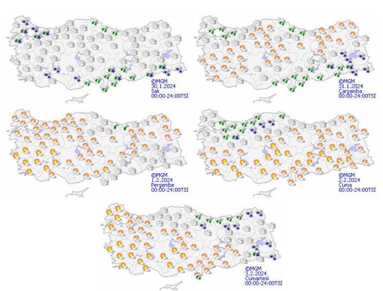 Meteoroloji Genel Müdürlüğünden alınan tahminlere göre hava sıcaklıkları kuzey ve iç kesimlerde mevsim normallerinin 1-3 derece altında, diğer yerlerde mevsim normalleri civarında seyredecek. Rüzgarın genellikle kuzey ve kuzeydoğu yönlerden hafif ara sıra orta kuvvette, Marmara ve Kıyı Ege’de kuvvetli ve kısa süreli fırtına (50 ila 70 km/saat) şeklinde eseceği tahmin ediliyor.